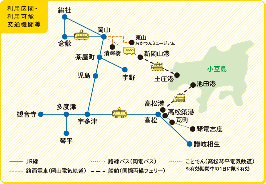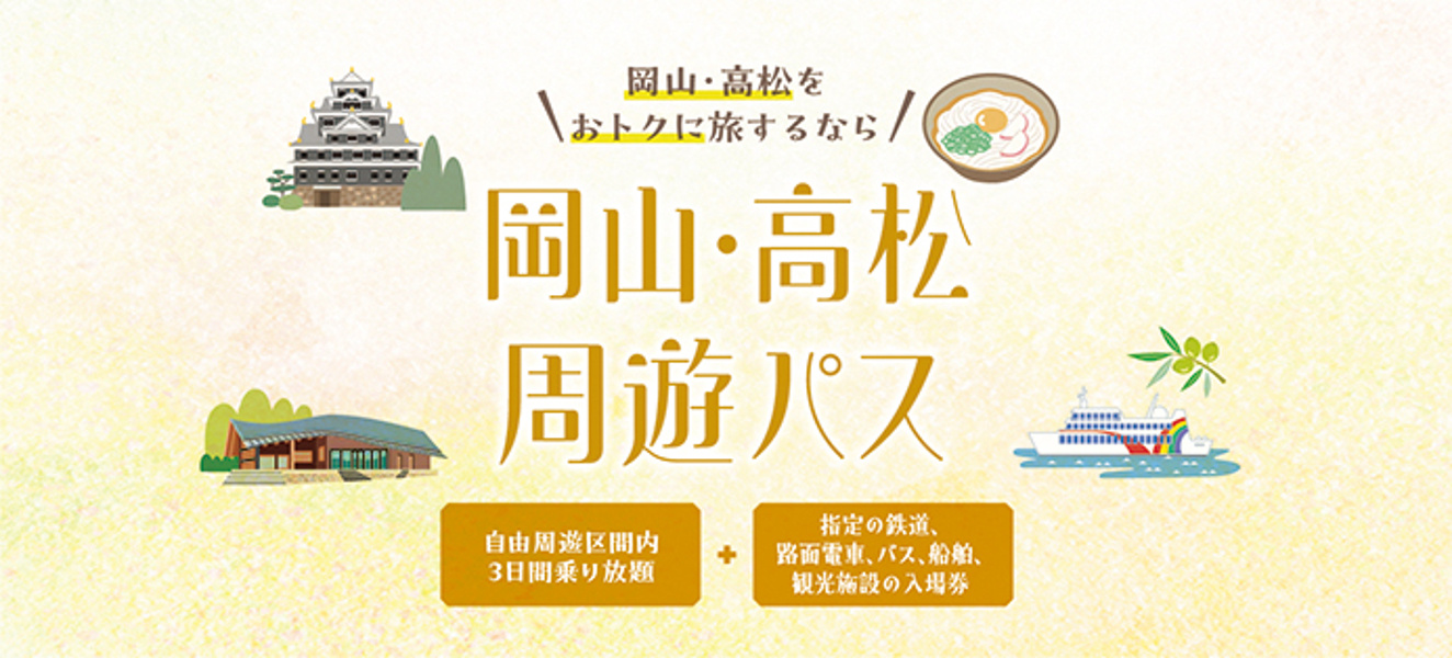 【10月3日利用分~】 岡山、香川・小豆島、高松・琴平を旅行する方におトク!JR、私鉄、路面電車、船舶、バス、観光施設の入場券などがセットになった乗り放題きっぷ。 ) 【ご注意ください】 ※琴平電気鉄道の「ことでん1日フリーきっぷ」は、有効期間中の1日間に限り、指定のフリー区間のみ有効です。 3日間・全線の乗り放題ではございませんのでご注意ください。 ※岡電バスのご利用は、新岡山港線のバスに限ります。詳しくは、商品詳細をご確認ください。 ※利用区間は、下記「利用区間・利用可能交通機関等」よりご確認ください。(例.記載のない「直島」等は含まれません。