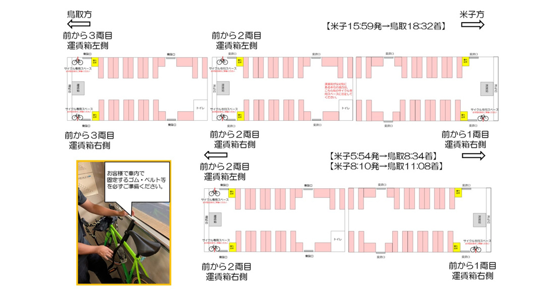 【2026/4/4~2027/3/7 土日祝(一部)】 【米子5:54発→鳥取8:34着、米子8:10発→鳥取11:08着、米子15:59発→鳥取18:32着】 自転車をそのまま列車に乗せて乗車することのできる「鳥取うみなみサイクルトレイン」(完全予約制) (自転車固定するゴム・ベルト等必要)(台数限定)(乗車券別途必要)