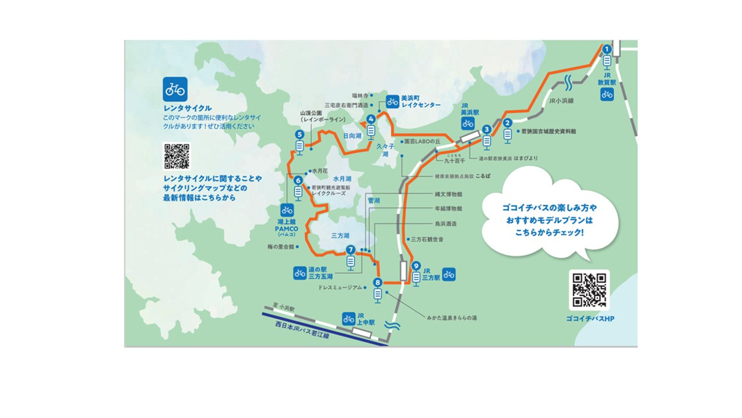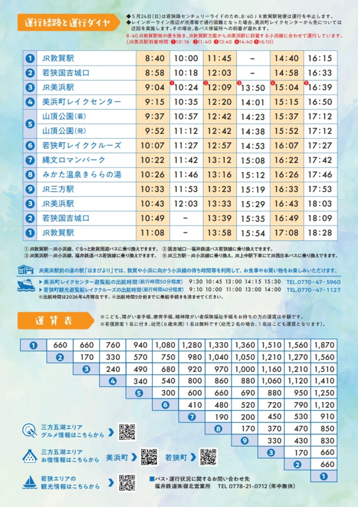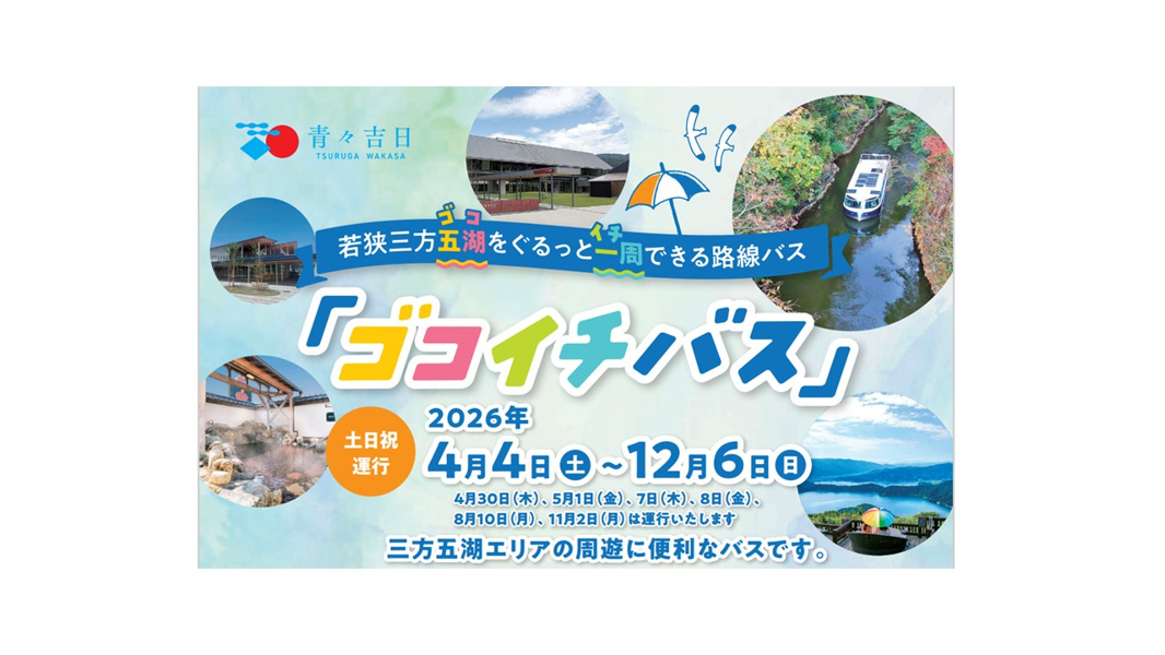 【2026年4月4日~12月6日/JR敦賀駅~JR美浜駅~JR三方駅~JR敦賀駅】 レインボーラインからの山頂公園や三方五湖をフリーで巡ることができる便利なバスです(バス停留所以外での乗降不可) ※本チケットはゴコイチバス全区間が乗車できるチケットです