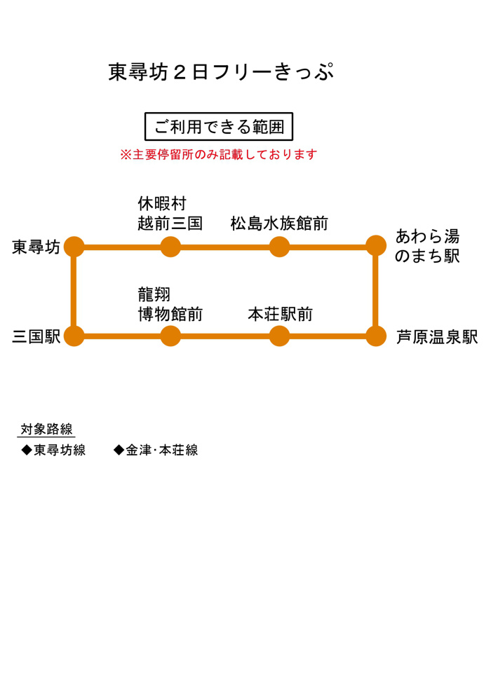 【2026年4月1日~】 東尋坊エリアの観光に! 指定区間で二日間乗り降り自由のフリーきっぷです。 ※tabiwaチケットでは、フリーきっぷ補助チケットの優待サービスメニューはご利用になれません。