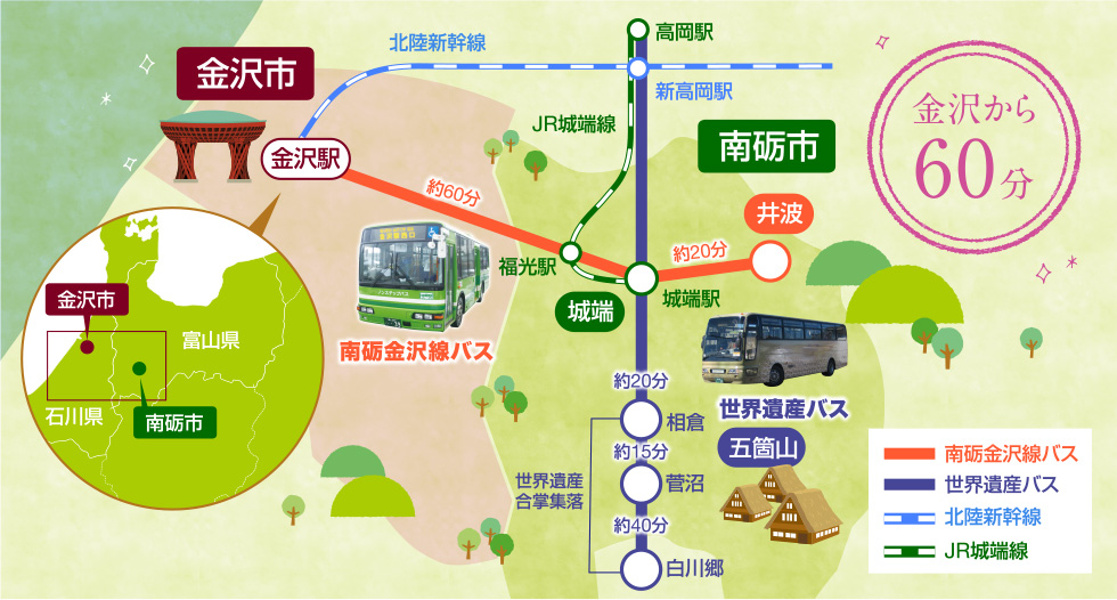 【2026年4月1日~】 南砺金沢・世界遺産バスフリーパスは、「世界遺産五箇山合掌造り集落」や「木彫りの里・井波」「越中の小京都・城端」の観光に最適なお得なバスチケットです。金沢駅と井波・城端を結ぶ「南砺金沢線バス」と世界遺産合掌造り集落へのアクセスに便利な「世界遺産バス」の2つのバスが3日間乗り放題!レンタサイクルなどの特典もついています。