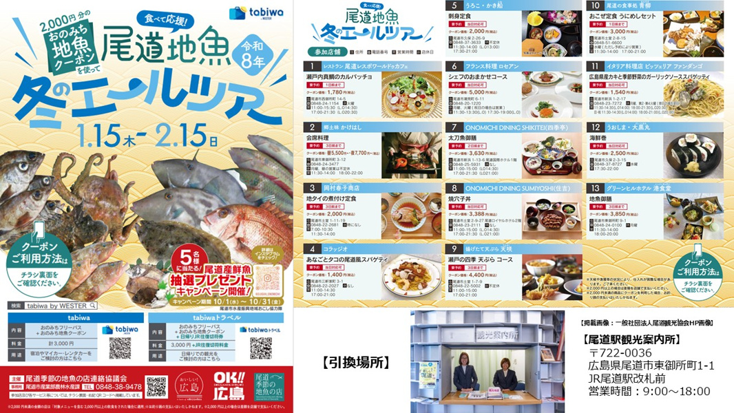 おのみちバス指定区間内1日乗車と千光寺山ロープウェイ往復がセットになったお得な乗車券。尾道市内観光の際は、ぜひご利用下さい。 【一日乗車券 おのみちフリーパス:千光寺山ロープウェイ往復+おのみちバス1日乗車+観光施設割引】 ※引換先:尾道駅観光案内所(JR尾道駅改札前) ※本商品の「おのみちフリーパス」は、尾道駅前バスセンターや千光寺山ロープウェイ乗り場ではお引換えできませんのでご注意ください。 【おのみち地魚クーポン「冬のエールツアー:2026年1月15日(木)~2026年2月15日(日)」】 期間中、各店舗自慢の地魚料理を提供します。バラエティ豊かな尾道の地魚料理を是非ご堪能下さい。 ※下記、商品詳細をご確認いただきご利用対象店舗に事前予約をお願いいたします。(店舗により予約期限が異なりますのでご注意ください。) ※ご予約後、ご変更される場合は必ず予約先の店舗にご連絡をお願いいたします。 ※季節毎の設定になりますので、旬の地魚をお楽しみください。 ※天候や漁獲等の状況により、仕入れが困難な場合があります。ご了承ください。