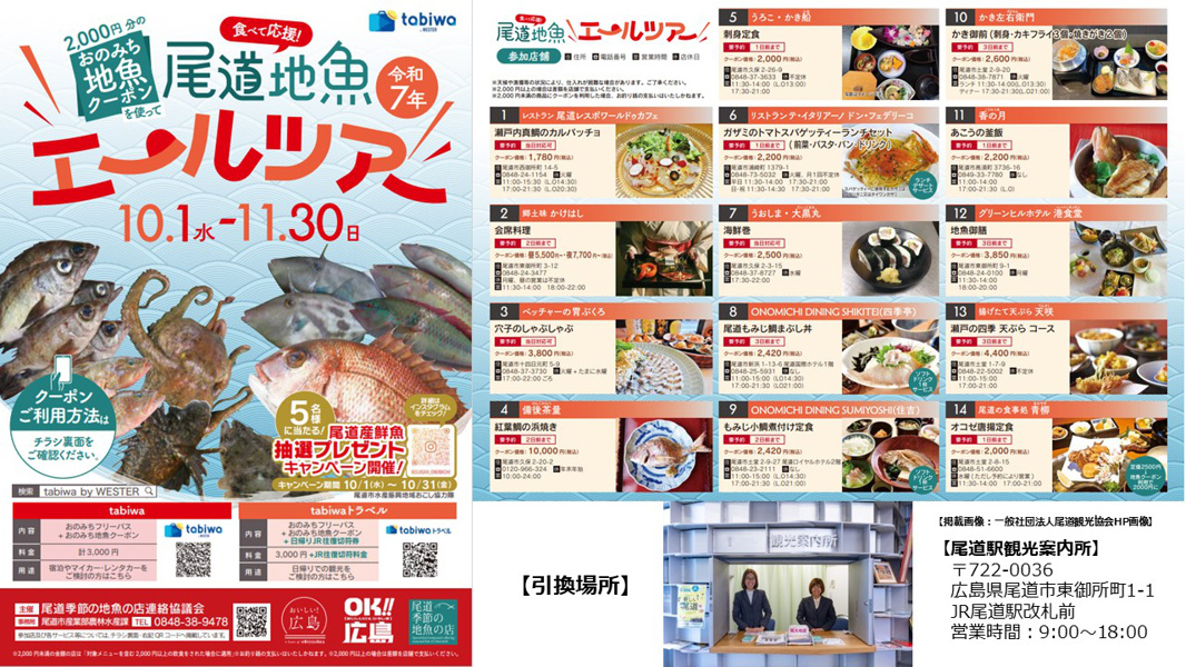 おのみちバス指定区間内1日乗車と千光寺山ロープウェイ往復がセットになったお得な乗車券。尾道市内観光の際は、ぜひご利用下さい。 【一日乗車券 おのみちフリーパス:千光寺山ロープウェイ往復+おのみちバス1日乗車+観光施設割引】 ※引換先:尾道駅観光案内所(JR尾道駅改札前) ※本商品の「おのみちフリーパス」は、尾道駅前バスセンターや千光寺山ロープウェイ乗り場ではお引換えできませんのでご注意ください。 【おのみち地魚クーポン「秋キャンペーン:2025年10月1日(水)~2025年11月30日(日)】 期間中、各店舗自慢の地魚料理を提供します。バラエティ豊かな尾道の地魚料理を是非ご堪能下さい。 ※下記、商品詳細をご確認いただきご利用対象店舗に事前予約をお願いいたします。(店舗により予約期限が異なりますのでご注意ください。) ※ご予約後、ご変更される場合は必ず予約先の店舗にご連絡をお願いいたします。 ※季節毎の設定になりますので、旬の地魚をお楽しみください。 ※天候や漁獲等の状況により、仕入れが困難な場合があります。ご了承ください。