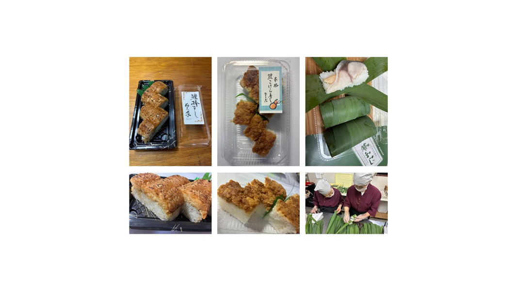 海南市は鱧(ハモ)の街として有名です。鱧の棒寿司は、煮鱧を強火で炙り、桶で型押しをしています。鱧の柿(こけら)寿司は、焼き鱧の身をすりつぶして重ね合わせた箱寿司です。 また、一つ一つ笹の葉で丁寧に包んだ早なれ寿司(サバ) と合わせて3種類のお寿司を販売いたします。どうぞ、お召し上がりください。