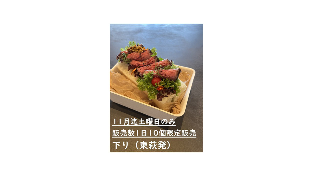 【11月まで土曜日のみ・販売数(1日10個)限定商品】 観光列車「〇〇のはなし」(東萩→下関・新下関)でご予約いただける軽食です ※当プランは「〇〇のはなし」の乗車券、座席指定券は含まれておりません。必ず、事前に「〇〇のはなし」のご乗車に必要な乗車券、座席指定券をお買い求めのうえ、お申込みいただきますようお願いいたします。 ※ご提供は東萩駅出発~滝部駅発車後までとなりますので、小串駅以遠から乗車のお客様はお申し込みいただけません。 ※月~金曜日/日曜日/祝日/12月以降は販売しておりません